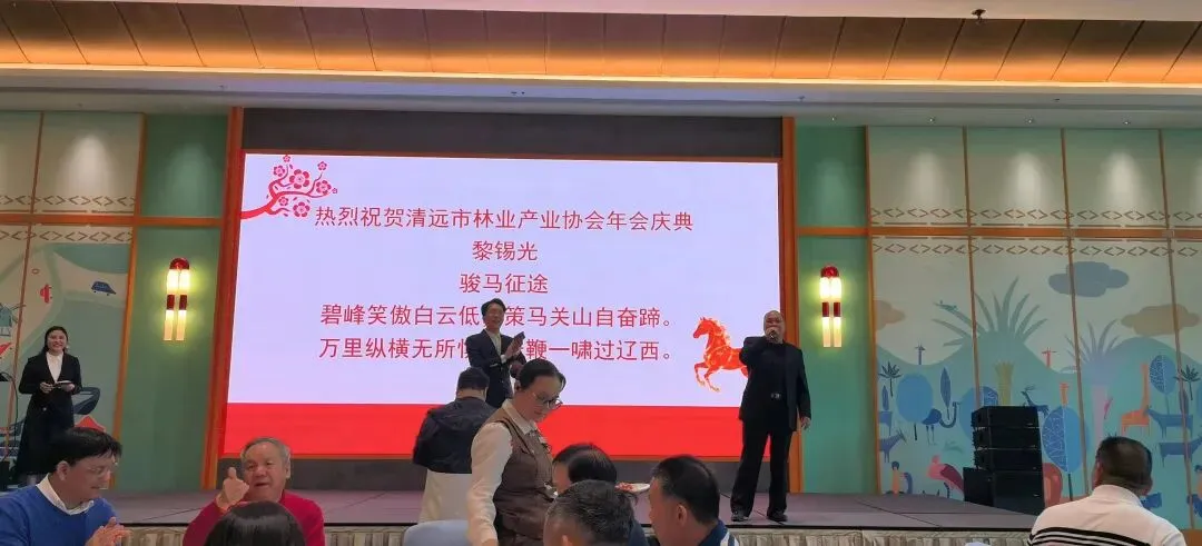 随后,清远市林业产业协会2026年年会在隆重而热烈的氛围中进行。年会现场,精彩节目与抽奖活动交替进行,将氛围一次次推向高潮。广东岭南诗社副社长、清远诗社社长、全国十佳诗人曾新友,协会负责人黎锡光现场各赋诗一首。“汗润千山百鸟归,云峰涌翠壮声威”“万里纵横无所惧,长鞭一啸过辽西”气势恢宏,激情澎湃!歌曲《心想事成》欢快而吉祥;《再创好明天》慷慨激昂,荡气回肠。