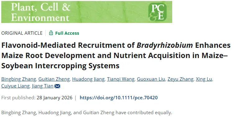 豆科/禾本科间作体系因其显著的养分互补效应被认为是实现作物高产与资源高效利用的栽培模式,其中大豆/玉米间作已被广泛报道能够提高玉米对氮磷等矿质养分的吸收效率。然而,间作体系中豆科植物根系分泌物如何精准招募功能微生物并作用于非豆科作物生长发育过程,长期缺乏明确机制解释。