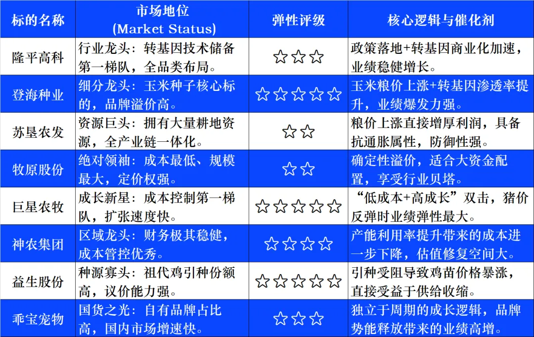 2. 细分赛道深度推演:弹性与格局2.1 种植与种业:进攻的矛(高弹性)逻辑推演:全球粮食去库周期结束,供需边际改善。USDA数据显示全球玉米库消比创10年新低,大豆库消比处于50%分位,粮价具备易涨难跌的基础。叠加“一号文件”催化,种业板块是当前反弹急先锋。市场地位分析:隆平高科:国内种业绝对龙头,转基因技术储备领先,在水稻和玉米种子领域具有极高的市场占有率和定价权。北大荒/苏垦农发:拥有大量耕地资源的种植业“地主”,是粮价上涨的直接受益者,具备极强的资源壁垒。弹性标的分析:登海种业:作为玉米种子龙头,其业绩对玉米价格及转基因渗透率极为敏感,是典型的高弹性进攻标的。农发种业/秋乐种业:近期表现活跃(如农发种业3天2板),市值相对较小,游资关注度高,具备极强的交易弹性。2.2 生猪养殖:防守的反击(周期反转)逻辑推演:虽然年初至今生猪板块表现落后,但行业基本面正在发生质变。猪价近期虽有反弹但仍处成本线附近,导致行业产能去化持续。2026年行业核心逻辑从“产能去化”转向“成本分化下的盈利兑现”。市场地位分析:牧原股份:行业“成本之王”,头均市值约2700-2800元,凭借极低的养殖成本(完全成本显著低于行业平均)和巨大的出栏规模,在周期底部具有最强的安全边际,是机构配置的底仓首选。温氏股份:稳健的行业老二,资金实力雄厚,与牧原共同构成了板块的“核心资产”。弹性标的分析:巨星农牧:成本控制能力逼近一线龙头(Q4成本改善至12元/公斤),且出栏增速快,头均市值较低(不足2000元/头),具备极高的业绩弹性。德康农牧/神农集团:属于“小而美”的代表,成本优势明显且处于快速扩张期,在猪价上行周期中往往能跑出超额收益。2.3 禽类养殖:供给侧的黑天鹅(供需错配)逻辑推演:受海外(美国、法国)高致病性禽流感影响,2025年国内祖代白羽肉鸡引种量大幅缩减,且主要来自非传统引种国,供给缺口将在2026年逐步体现。弹性标的:益生股份:作为上游祖代鸡引种龙头,对鸡苗价格最为敏感,是禽板块中弹性最大的标的。圣农发展:全产业链龙头,具备自主育种能力,受海外引种限制影响较小,市场地位稳固。