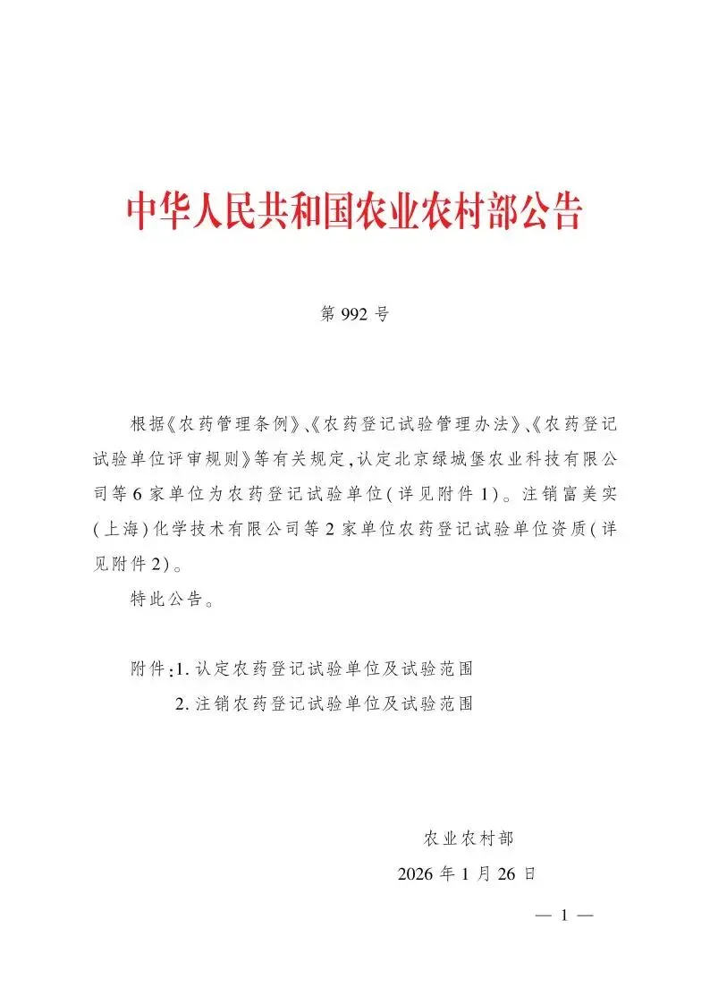 中华人民共和国农业农村部公告 第992号