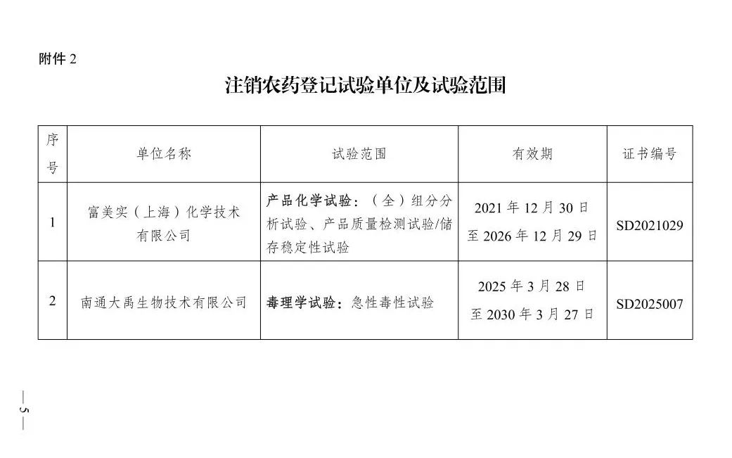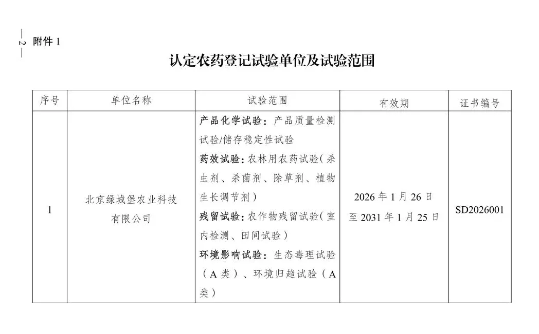根据《农药管理条例》《农药登记试验管理办法》《农药登记试验单位评审规则》等有关规定,认定北京绿城堡农业科技有限公司等6家单位为农药登记试验单位(详见附件1)。注销富美实(上海)化学技术有限公司等2家单位农药登记试验单位资质(详见附件2)。