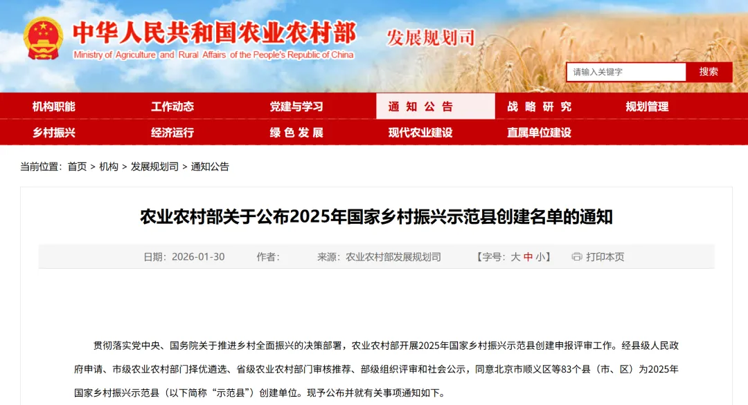 贯彻落实党中央、国务院关于推进乡村全面振兴的决策部署,农业农村部开展2025年国家乡村振兴示范县创建申报评审工作。经县级人民政府申请、市级农业农村部门择优遴选、省级农业农村部门审核推荐、部级组织评审和社会公示,同意北京市顺义区等83个县(市、区)为2025年国家乡村振兴示范县(以下简称“示范县”)创建单位。现予公布并就有关事项通知如下。