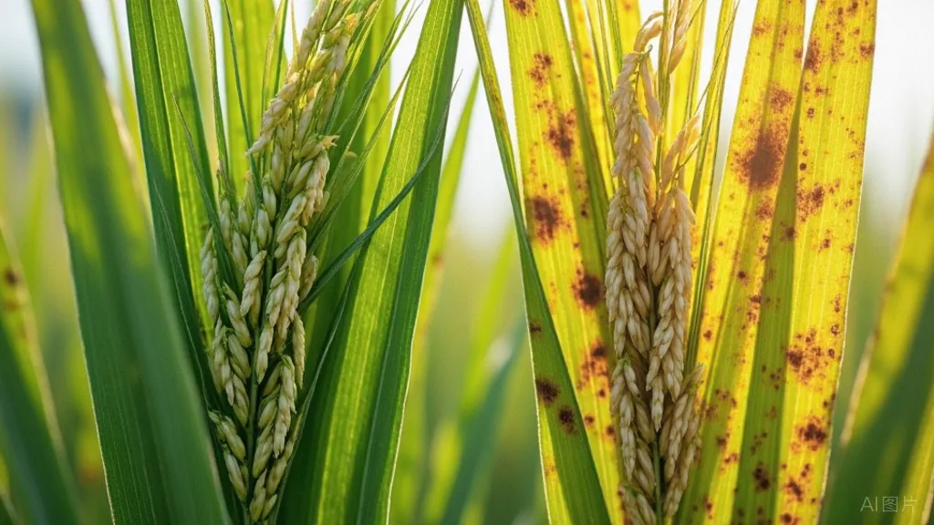 图1展示了在相同栽培条件和稻瘟病发生环境下,抗性水稻品种与感病水稻品种在田间稻瘟病发生情况的显著差异。左侧为抗性品种,其叶片上病斑数量稀少,且多为褐色的慢性型病斑,产孢能力低,病害发展缓慢,对植株整体生长和产量影响较小。右侧为感病品种,其叶片上布满大量病斑,病斑类型多为急性型,灰绿色,产孢能力强,病害蔓延迅速,严重时可导致叶片枯死,显著影响光合作用和最终产量。这种直观的对比清晰地揭示了选用抗性品种是防治稻瘟病最经济有效的措施之一。通过推广种植经过抗性鉴定的优良品种,可以从根本上提高水稻对稻瘟病的抵抗能力,减少化学农药的使用,保障水稻生产的稳产高产。在实际生产中,应定期监测当地稻瘟病菌生理小种的动态变化,科学布局和轮换不同抗性基因的品种,以延长抗性品种的使用寿命,维持其良好的防治效果。