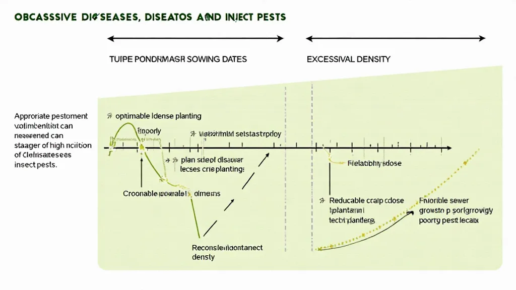 图4通过示意图对比了不同播种期和播种密度对病虫害发生的影响。上半部分展示了调整播种期对病虫害的控制作用:例如,通过适当推迟播种,使作物的易感病生育期(如水稻分蘖期)与病虫害的发生高峰期(如二化螟产卵盛期)在时间上错开,从而有效减少病虫害的侵染和危害。下半部分展示了不同播种密度对田间小气候和病虫害发生的影响:左侧为合理密植,植株间通风透光良好,湿度适宜,作物生长健壮,病虫害发生较轻;右侧为过度密植,田间荫蔽,湿度过高,作物长势弱,有利于稻瘟病、纹枯病等喜湿病害的发生和蔓延。该示意图直观地说明了通过科学调整播种期和播种密度,可以优化作物生长环境,避开病虫害高发期,从而有效减轻其危害,是农业病虫害综合治理中简单易行且经济有效的重要措施。