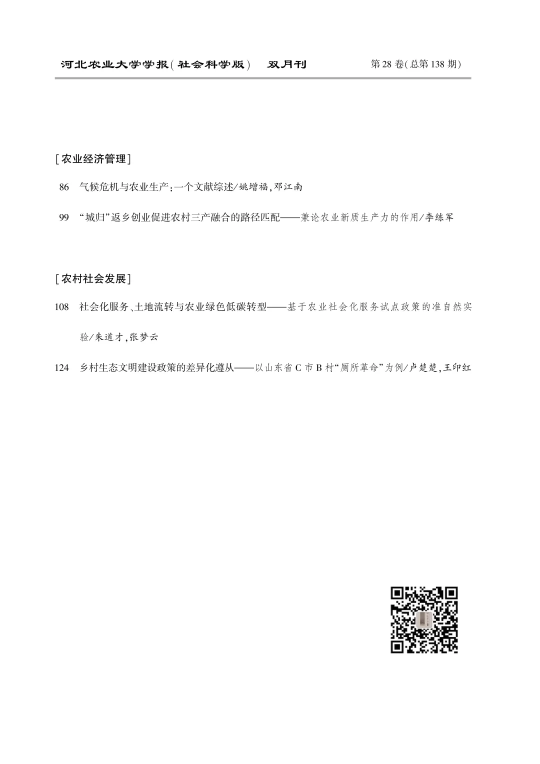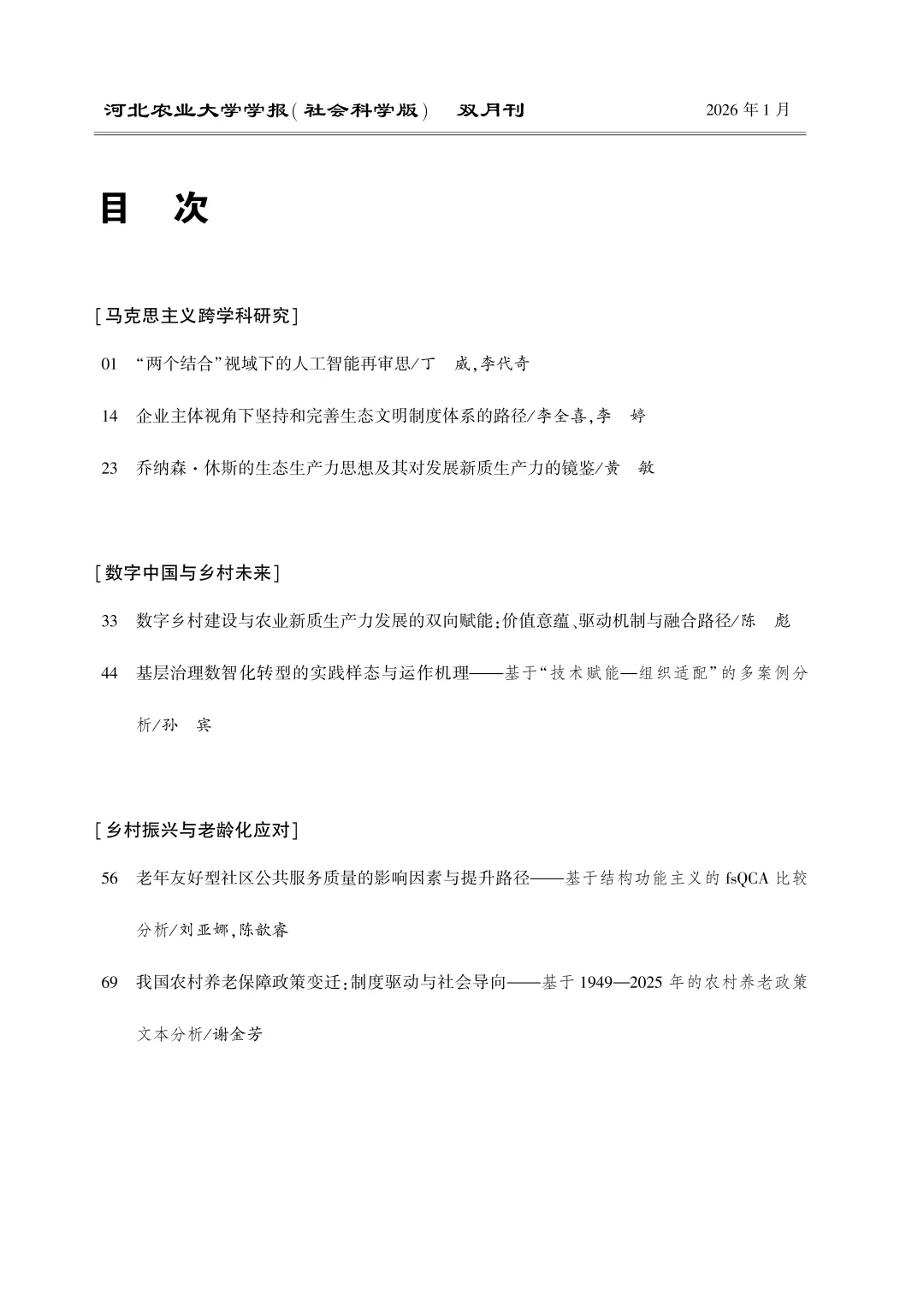 2026年主要栏目:马克思主义跨学科研究、农业经济管理、农村社会发展、数字中国与乡村未来、乡村振兴与老龄化应对、乡土文化等。