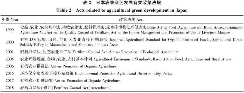 日本国土面积小、人口密度大,是典型的“人多地少”的小农国家。20世纪60年代,日本在农业生产中使用大量化肥农药,造成了大量自然资源的浪费以及严重的环境污染。为此,日本提出了“环境保全型农业”概念。主要做法:一是持续完善法律体系(表2)。1999年颁布了《食品、农业、农村基本法》,围绕“提高农产品自给率、提高农业经营效率、发挥农业多种功能、促进农村振兴和发展”4个主要目标,对农业政策进行调整。先后出台《持续农业法》《肥料管理法》《家畜排泄物法》(简称“农业环境三法”)等,明确了农业生产中化肥农药减量施用要求、养殖废弃物排放阈值、生态农业生产标准等,通过严格的登记制度和信息公开加强审查监管。二是财政补贴激发参与热情。将政府补贴、贷款优惠与环境保护活动挂钩,引导农户参与农业绿色发展。如《持续农业法》推行“生态农户”资格认证制度,对获得“生态农户”认证的农户提供金融、税收等方面优惠。三是科技推广赋能农业生产。通过政府拨款加大科技投入,成立农业科技推广专项基金,积极研究并大力推广农业清洁生产技术,如堆肥还田、土壤污染治理等土壤改良技术,低投入施肥技术、肥效调节型肥料、土壤诊断等化肥减量措施,以及新的除草和病虫害防控技术等农药减量技术等,形成了减化肥及减药型、废弃物再生利用型、有机农业型3种农业模式,提升农产品品质和农业投入品利用率、保护农业生态环境。