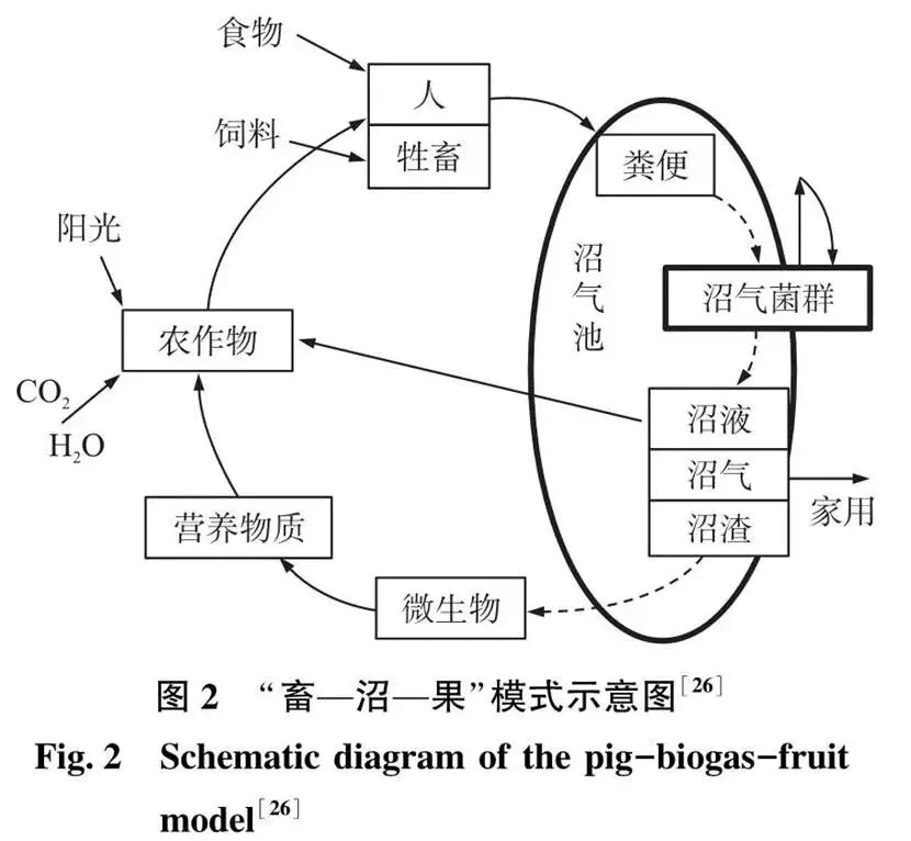 2.2.2 种植养殖循环 几十年来,随着肉蛋奶等需求的持续增加,我国规模化养殖快速发展,种养分离现象愈发突出,种植业和养殖业脱节,也是造成大量畜禽粪污资源浪费和碳排放增加的重要因素。在我国农耕文明长期发展进程中,形成了趋时避害的农时观、辨土施肥的地力观、变废为宝的循环观,这些传统经验为未来的农业绿色可持续发展提供了宝贵参考。比如在春秋战国时期发展出的“桑基鱼塘”农业模式,是通过桑叶养蚕、蚕沙喂鱼、塘泥种桑,实现种桑、养蚕、养鱼三者之间的物质循环和能量转化,可以说种养结合是我国传统农业“地力常新壮”的奥秘所在。因此,实现农业高质量发展,需要大力推动绿色种养循环。种植与畜禽养殖结合的常见模式是“畜—沼—果”种养循环模式(图2),即畜禽养殖、高效厌氧发酵、固体菌肥基施和液体菌肥追施组成的体系。养殖产生的粪污通过厌氧发酵无害化处理后,沼渣作为底肥、沼液作为追肥,通过水肥一体化设施用于粮食和果蔬种植,减少化肥农药使用,防止土壤板结,培肥地力; 沼气供养殖场及附近农户使用。加工农田产生的秸秆等作为畜禽养殖所需的部分饲料,实现种植系统和养殖系统的有机结合。在地方实践上,如河北省阜城县通过发展秸秆饲料化、冬桃种植、肉牛养殖,探索低消耗、低排放、高收益的发展路径。2020年,阜城县张家桥村生态农场肉牛存栏达到300多头,产值700多万元,收割周边农户玉米约800 hm2,价值560万元,采摘冬桃75万kg,销售收入近400万元,带动了区域生态品牌打造和周边乡村农民就业。此外,“鱼菜共生”是结合水产养殖与水耕栽培技术的复合耕作体系,通过硝化作用等将饵料残渣和排泄物等物质转化分解为植物根系可吸收利用的营养物质,并实现水质净化,达到动物、植物、微生物三者之间的生态平衡,探索低碳生产模式和减少养殖尾水排放的方法。在地方实践上,如河南郑州等地实施鱼池与莲藕池相结合的养殖模式,养殖草鱼、加州鲈等品种,不仅降低了饲料和其他生产资料的投入,还实现了商品鱼和莲藕的双丰收,提高了经济效益,同时促进了农业可持续发展。