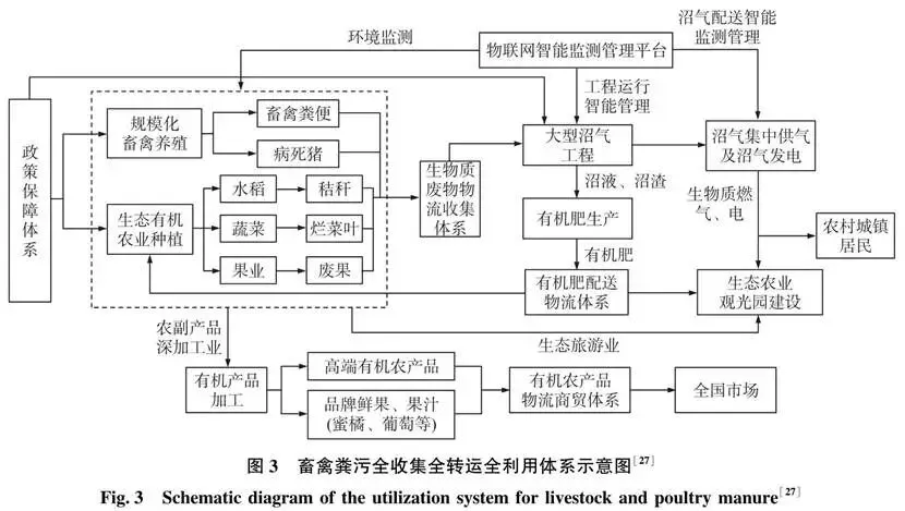 2.2.3 区域农业废弃物循环再利用 农业绿色发展既包括生产、生活、生态“三生共生”,又包括产前、产中、产后“三产融合”。在农户、种养大户、家庭农场、农业园区等经营单元内建立生态循环链的基础上,还要推进区域大循环,即推进种植业、养殖业与农产品加工、销售等对接,促进不同经营主体合作,实现物质、能量和经济的畅通循环。以江西省新余市渝水区为例,渝水区是江西省养殖大县区,其根据经济发展和环境承受能力,科学确定养殖数量和布局。并以县区为单元,以第三方集中处理为核心,以农业废弃物处理和资源化利用(粪污无害化处理,大型沼气工程供气站或发电站、有机肥生产厂)为纽带,上联n家畜禽养殖业主体、下接n家种植业主体,逐步建立覆盖全区的畜禽粪污全收集全转运全利用体系(图3)。沼气供气发电、有机肥生产每年净收益约1 540万元,形成了生态产业链,创造了就业机会,增加了园区利润和农民收入,促进了县域农业生态循环产业发展。同时解决了乡镇居民日常清洁用能,还有效遏制区域内畜禽养殖粪便造成的面源污染,带动了多家大型企业集聚,投资建设农业休闲观光旅游、大型养殖小区和肉产品加工项目等,给社会经济发展注入了新活力。