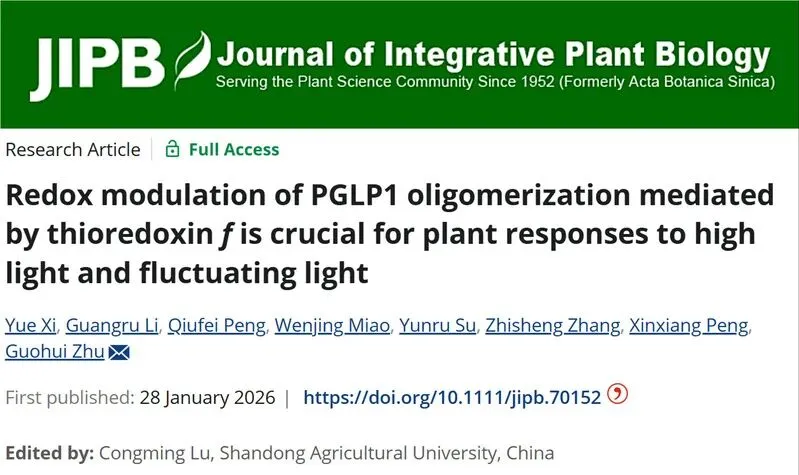 近日,华南农业大学彭新湘/朱国辉团队在植物学TOP期刊Journal of Integrative Plant Biology(五年影响因子10.8)上发表了题为“Redox modulation of PGLP1 oligomerization mediated by thioredoxinf is crucial for plant responses to high light and fluctuating light”的研究论文。该研究揭示了PGLP1作为硫氧还蛋白f(Trxf)的作用靶点,能够通过氧化还原依赖的寡聚化状态转变来响应光环境变化,从而实现对光呼吸代谢的精细调控。