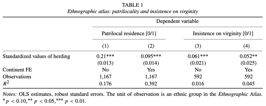 婚前贞洁观念(Insistence on Virginity) :该数据库还包含社会对婚前性行为的态度。表1中的第3和第4列显示,依赖畜牧业较多的社会更倾向于要求女性在婚前保持贞洁。