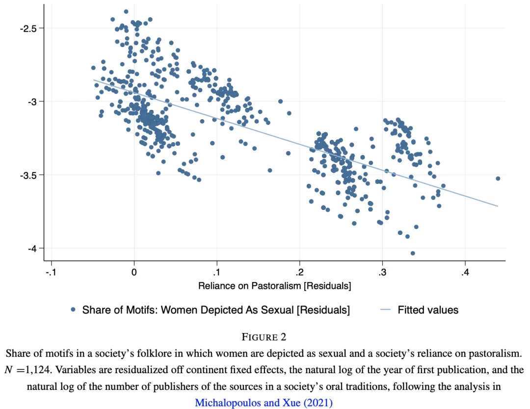 民俗与口述传统中的性别观念 :作者进一步分析了Yuri Berezkin对世界近千个族群的民俗故事进行的整理与分类,以评估民俗文化中对女性性吸引力的描述是否与畜牧依赖度有关。研究发现,畜牧依赖度高的族群中,描述女性性吸引力的民俗故事比例较低 。这表明,畜牧社会的文化传统可能更倾向于强调女性贞洁,反映出对女性性行为更强烈的社会约束。这一发现进一步验证了畜牧依赖度与限制女性性自由之间的关联。
