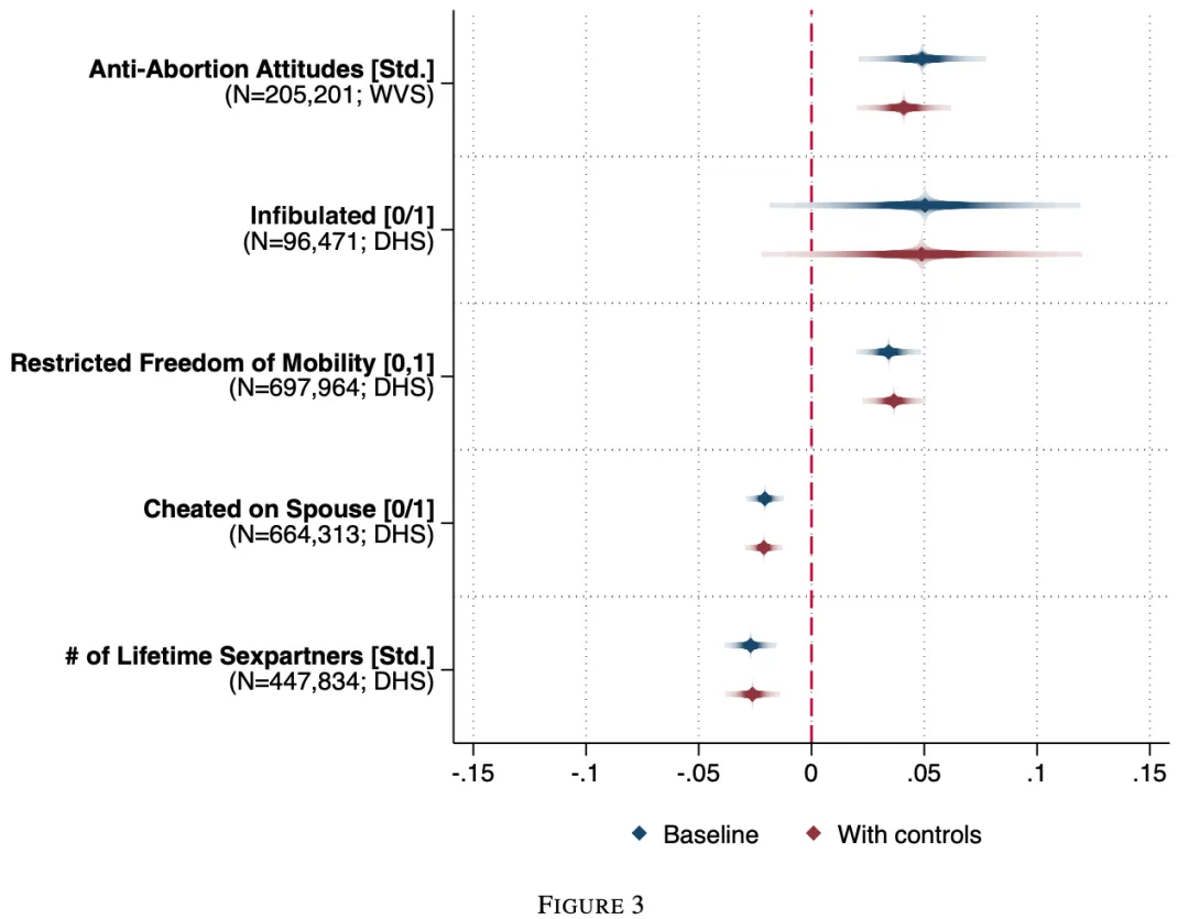 男性缺席和行为监控问题 :畜牧社会中的男性通常要离家外出数天、数周甚至数月,这种长期不在场使得男性无法直接监视女性的行为,因而需要通过文化和习俗手段来降低女性在此期间的外遇可能性;限制女性贞洁的习俗需求 :畜牧社会中有许多记录表明存在着对女性贞洁的高度关注。例如,地中海地区的牧民社区对女性的贞洁和处女身份极为重视,并认为女性婚后应继续保持纯洁和贞洁;在贝都因人、哈萨克人、蒙古人、亚美尼亚人等牧民族群中,也有关于女性忠诚和性自律的严格规范。这些规范通常会发展成制度化的形式,例如锁阴术、外出限制等,以确保女性在男性外出期间仍然保持贞洁。为验证这一假设,作者采用了多层次的数据来源,结合历史与现代的民族学数据进行实证分析。研究发现,来自以畜牧业为主 的历史族群的个体,更倾向于支持反堕胎 、接受割礼限制 、对女性自由流动设限 等行为。这些与男性长期不在家(需要外出)的历史背景密切相关,而非单纯的性别优势结构或经济发展差异所致。后续工具变量 策略的使用确认这一发现具有因果性 。