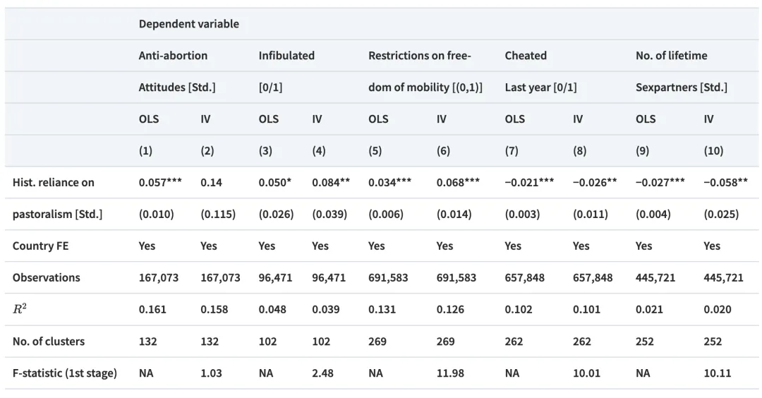 反堕胎态度 :研究使用WVS的堕胎态度数据来衡量反堕胎的程度。回归结果表明,祖先依赖畜牧业的族群现代个体更倾向于反对堕胎。这一结果符合作者假设,即对堕胎的反对可能是为了增加女性因婚外行为怀孕的风险,进而减少女性的性自由;女性割礼 :在非洲的13个国家中,DHS提供了女性是否接受割礼(尤其是锁阴术)的数据。锁阴术是一种极端的女性割礼形式,通过减少性快感和增加性行为的不便来控制女性性行为。回归结果显示,祖先畜牧依赖度高的族群在现代社会中女性更可能接受割礼;行动自由限制 :行动自由限制反映了社会对女性流动和活动的限制。DHS中的数据包含女性在外出、访问亲属等活动上的受限情况。研究发现,祖先畜牧依赖度较高的族群更倾向于限制女性的行动自由;性行为规范 :性行为规范包括女性的性伴侣数量 和是否在婚姻中保持忠诚 等变量。在DHS的样本中,作者分析了女性的性伴侣数量和婚内出轨情况,以此来衡量对女性性行为的文化规范。在包含37个国家的447,834名受访者的样本中,结果显示祖先畜牧依赖度越高的族群,其后裔的性伴侣数量越少,且更倾向于在婚姻中保持忠诚。这一结果支持了畜牧依赖社会通过文化规范抑制女性婚外性行为的假设。工具变量的结果 ⬆️IV分析的结果与基准回归基本一致,进一步支持了畜牧依赖度对现代性别规范影响的因果解释。