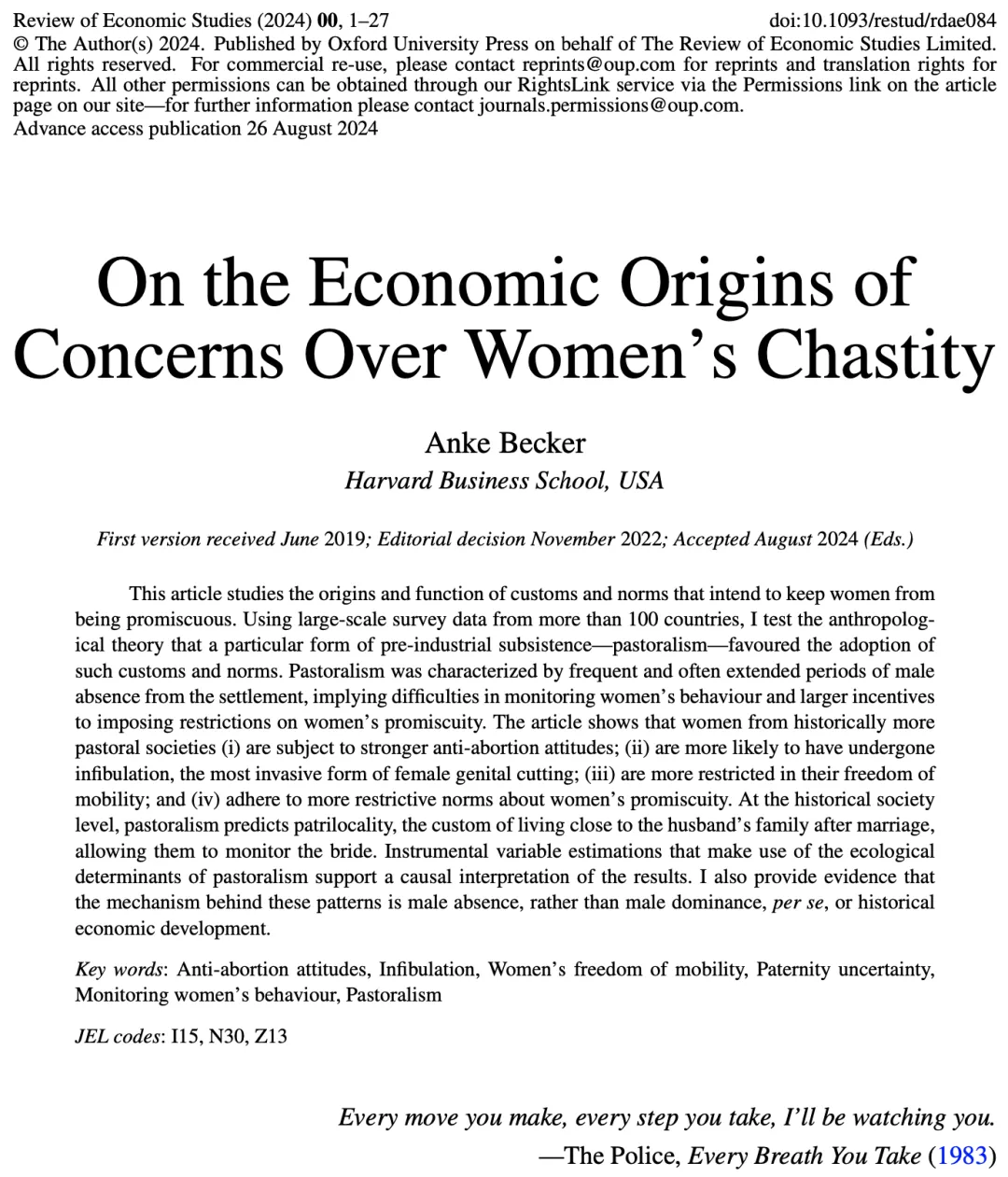 原文信息 Anke Becker, On the Economic Origins of Concerns Over Women’s Chastity, The Review of Economic Studies , 2024;, rdae084, https://doi.org/10.1093/restud/rdae084