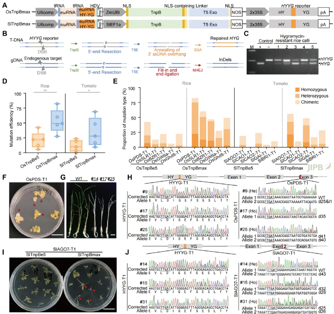 图1 ωRNA截短及T5外切酶融合策略显著提高编辑效率并诱导微同源依赖型缺失突变在水稻中, TnpBmax在5个靶点上的编辑效率达到27.3%–81.5%, 较未使用SSA代理筛选系统的版本提升显著。更重要的是, 纯合突变体的比例从1.2%提升至8.9%, 嵌合体比例从68.6%降至21%。在番茄中, 编辑效率从10.5%提升至34.9%, 并成功获得了纯合突变体, 例如slago7纯合敲除突变体表现出典型的针状叶片表型 (图2)。图2基于同源修复的代理筛选系统耦合TnpB大幅提升植物编辑效率及纯合突变比例该研究不仅提升了TnpB在植物中的编辑性能, 还通过耦合编辑工具与同源修复代理筛选系统, 实现了编辑细胞的高效筛选与富集。TnpBmax为植物基因组编辑工具箱增添了一款紧凑、高效、普适的新工具, 尤其适用于递送容量受限的应用场景, 也为紧凑型基因编辑工具的优化与开发提供了可行路径。中国农业科学院/南方科技大学朱健康院士和崖州湾国家实验室青年科学家田益夫博士 (原朱健康院士团队博士后) 为该论文的共同通讯作者。中国农业科学院博士生李恩泽、崖州湾国家实验室博士后谢吉勇 (原朱健康院士团队博士生) 为共同第一作者。研究获得国家自然科学基金、国家重点研发计划和中国博士后科学基金等项目的资助。Li, E., Xie, J., Li, X., Zheng, Z., Wang, M., Zhu, J., and Tian, Y. (2026). A surrogate-selection-enhanced TnpBmax platform enables efficient genome editing in rice and tomato. J. Integr. Plant Biol. https://doi.org/10.1111/jipb.70159JIPB面向全球读者, 刊载整合植物生物学领域的重要创新成果, 包括宏观与微观层面的原创研究论文、综述、简讯、新资源、新技术以及评论性文章等。2025年期刊指标显示: 2年SCI_IF: 9.3, 5年SCI_IF: 10.8, 位列植物科学TOP 3.1% (Q1 区); Scopus CiteScore 19.1, 位居植物科学TOP 2%。JIPB属于中科院期刊分区生物学大类1区、植物学小类1区, 入选中国科协《植物科学领域高质量期刊分级目录》T1级期刊, 获得由科技部等七部门联合实施的“中国科技期刊卓越行动计划” 连续两期项目资助 (2019–2028)。