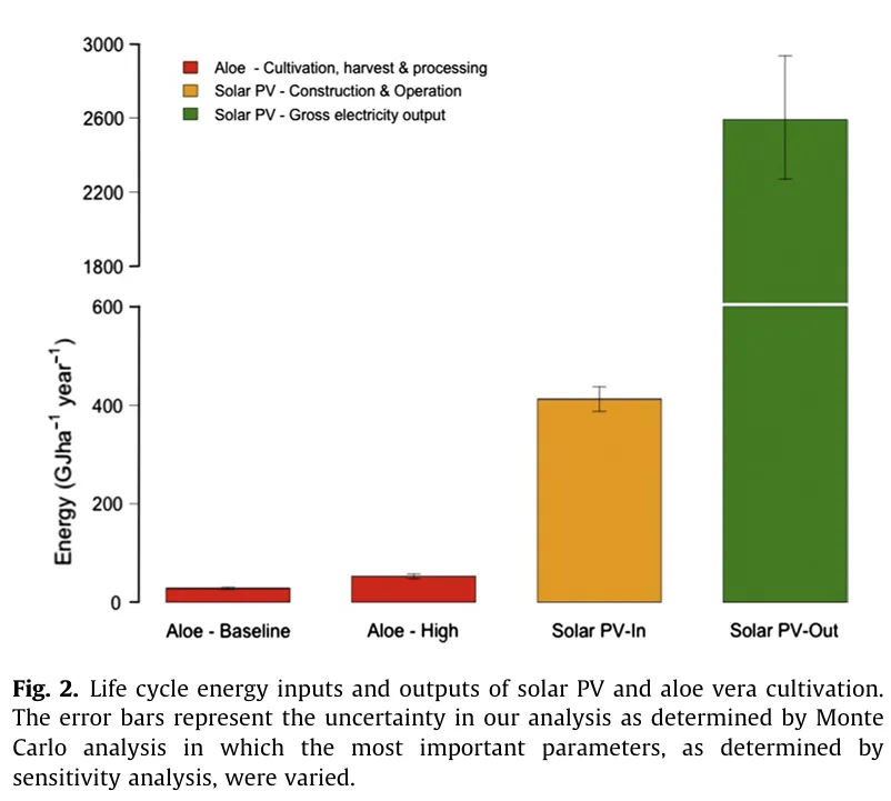 在土地与水资源有限、且农业与生活用水需求持续上升的背景下,如何满足不断增长的能源需求是一项重大挑战。本研究的目标是探索将太阳能基础设施与农作物进行共置(colocation)的机会,以最大化土地与水资源利用效率。我们以印度西北部为例,对比评估了太阳能设施与芦荟种植(该地区广泛推广且具有重要经济价值的一种土地利用方式)的能量投入/产出、用水、温室气体排放以及经济性。生命周期分析表明,共置系统在部分农村地区具有经济可行性,并可能为农村电气化与经济增长提供机会。用于清洗太阳能板的水投入与维持芦荟年生产所需水量相近,这意味着可以将两种系统集成在同一地块上,从而提升干旱区土地与水资源利用效率;对一个假想共置系统的分析也显示,其单位用水的经济回报高于任一单独系统。
