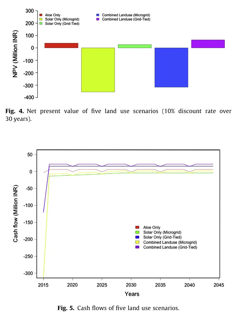 经济账:针对 5 ha 地块设置 5 种用地情景(仅芦荟、仅光伏并网、仅光伏离网/微电网、并网共置、离网共置),用 NPV 与现金流对比。