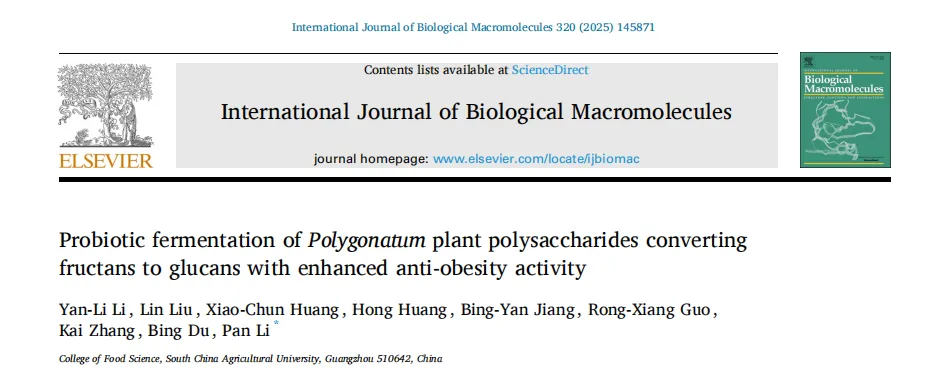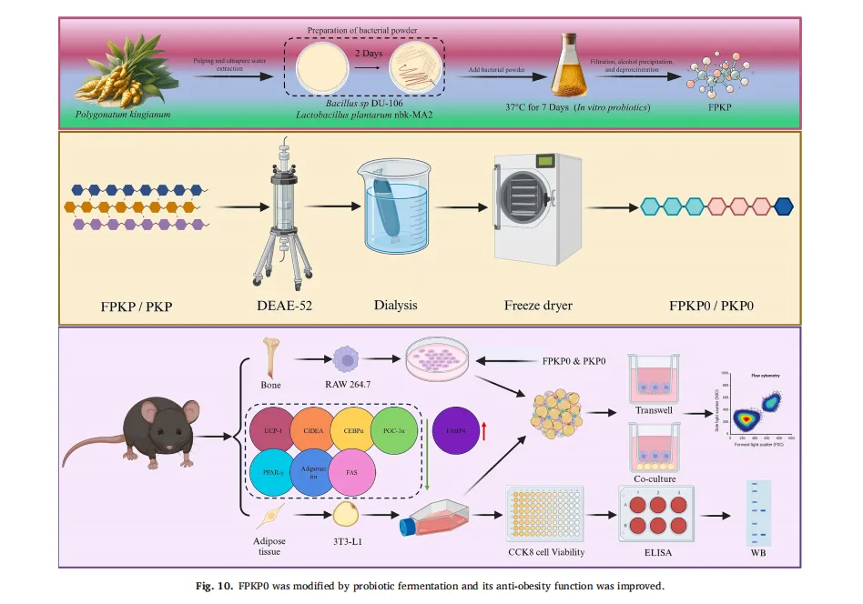 黄精(Polygonatum sibiricum(Hemsl))是我国传统的食药植物,主要分布于云南、湖南和东北地区。它已被广泛用于治疗肥胖,气血失调和代谢失衡。以前的研究已经确定多糖是主要的生物活性成分,负责其健康益处,特别是在减轻代谢疾病。例如,来自黄精的多糖已被证明可有效减轻高脂饮食诱导的小鼠肥胖,证明了显著的抗肥胖潜力。鉴于不同黄精属植物多糖结构的多样性导致其生物活性的差异,本研究以黄精属植物滇黄精多糖(Polygonatum kingianum,PKP)为研究对象。我们的初步实验结果表明,PKP也表现出显着的减肥作用。基于先前对来自各种来源的多糖的益生菌发酵的研究,假设益生菌发酵可以进一步改善PKP的抗肥胖活性,据我们所知,这是一个尚未充分探索的领域。鉴于PKP的单糖组成相对简单,其特征在于高比例(超过50%→1)-β-D-Fruf-(2→),如所报道的,研究益生菌发酵对PKP的结构和抗肥胖活性的影响将提供对益生菌发酵通过结构修饰增强其抗肥胖作用的机制的见解。