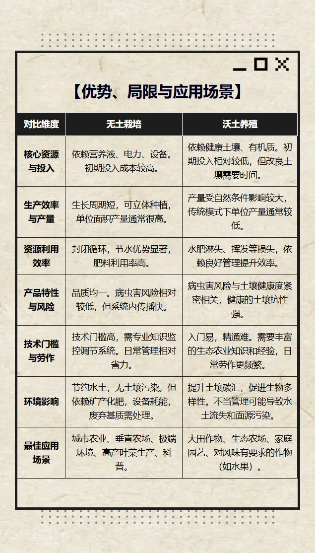 追求高产、稳定和空间效率,无土栽培优势明显。若追求风味、生态价值或降低长期投入,沃土养殖是方向。