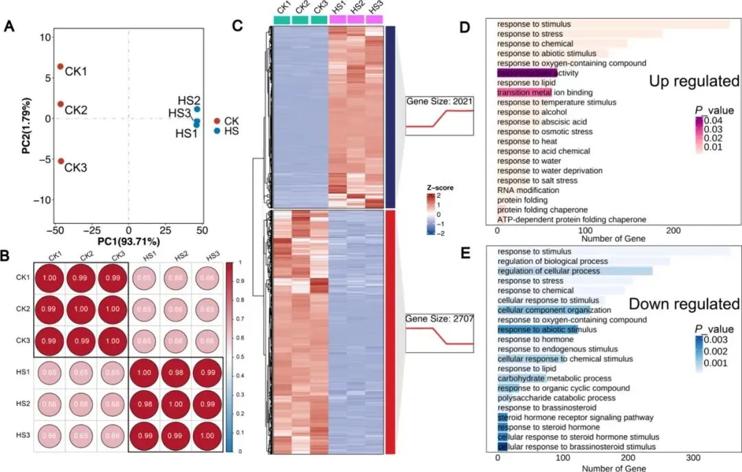 为揭示热胁迫影响NHCC的分子机制,研究对对照组与热胁迫处理组叶片进行RNA-seq分析。PCA和皮尔逊相关性分析显示样本重复性良好。以|log2FC| ≥ 2且P < 0.01为阈值,共鉴定出4728个差异表达基因(DEGs),其中2707个下调,2021个上调。GO富集分析表明,这些DEGs显著富集于热胁迫响应、非生物胁迫应答、温度感知、激素信号转导、水分缺失响应及初级代谢等通路,说明热胁迫通过大规模重编程转录组,干扰关键生理过程,进而引发NHCC的表型损伤。