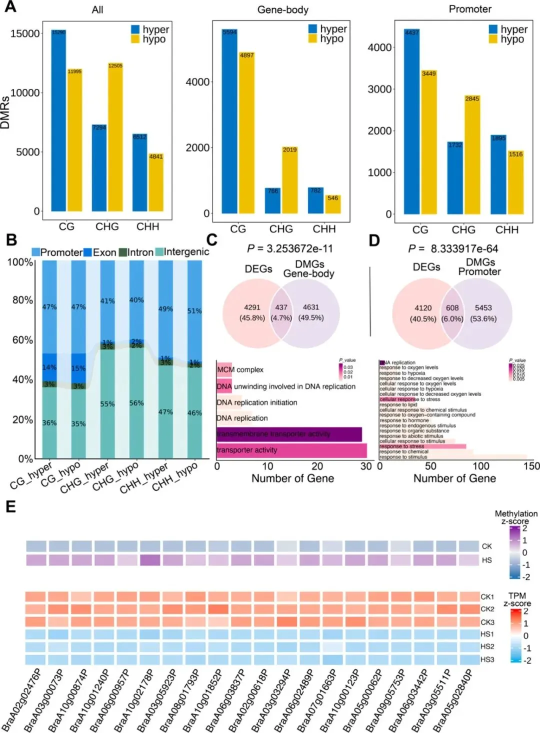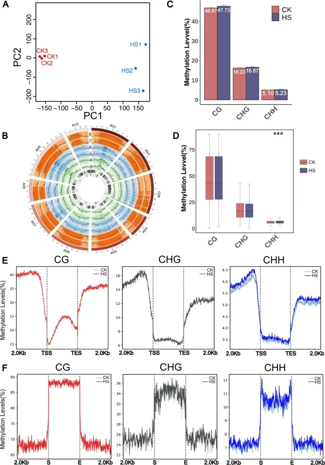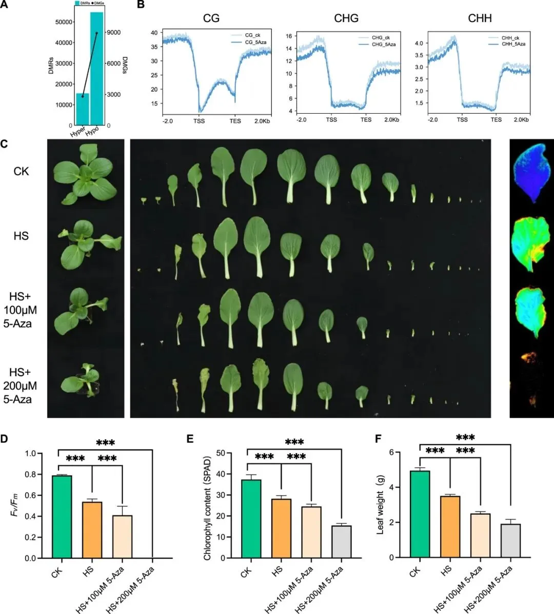 温度是影响植物生长发育的关键环境因子,热胁迫可导致光合抑制、叶片衰老甚至植株死亡。在全球气候变暖背景下,解析植物耐热机制具有重要理论与应用价值。研究表明,DNA甲基化可通过调控启动子活性影响胁迫相关基因表达。尽管在拟南芥、棉花、甘蓝等物种中已有相关发现,但作为喜凉叶菜作物的不结球白菜(NHCC)对热胁迫高度敏感,其耐热性的表观遗传调控机制仍不清楚。因此,揭示DNA甲基化在NHCC热胁迫响应中的作用,对理解其耐热机理及分子育种具有重要意义。