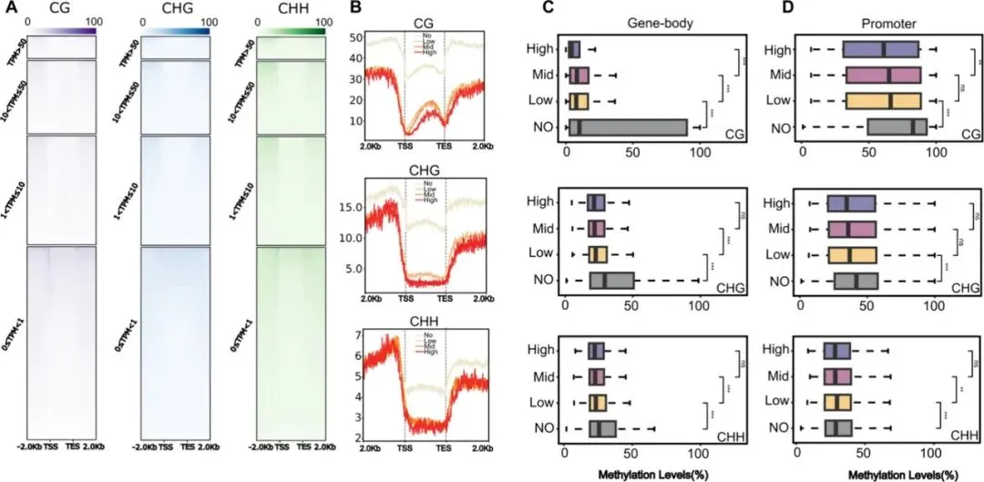 为探究DNA甲基化对基因表达的调控作用,研究基于TPM值将NHCC全基因组基因分为四组进行分析。结果显示,在CG、CHG和CHH三种序列背景下,DNA甲基化水平均与基因表达呈显著负相关:转录沉默或低表达基因(0 ≤ TPM < 1)的甲基化水平最高。进一步分析基因本体及其侧翼区域发现,尽管高、低表达基因间甲基化差异有限,但沉默基因在所有序列背景下均呈现最强甲基化信号。对基因区及启动子区的统计分析再次证实,甲基化程度越高,转录活性越低。上述结果表明,DNA甲基化在NHCC中主要发挥转录抑制作用。