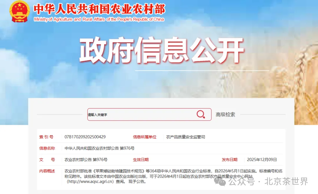 北京茶世界资讯:日前,农业农村部正式发布公告,批准《苹果矮砧栽培建园技术规范》等364项中华人民共和国农业行业标准,自2026年5月1日起实施。