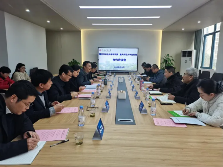 2026年1月28日下午,重庆师范大学生命科学学院与重庆市林业科学研究院在重庆师范大学逸夫实验楼举行战略合作洽谈会,双方就科研合作、人才培养、成果转化等事宜展开深入研讨。重庆市林业科学研究院党委书记、院长蒋宣斌,副院长朱恒星等一行到访交流。重庆师范大学生命科学学院党委书记付长波,院长邱宝利及班子成员、相关科研团队骨干教师参加了会议。