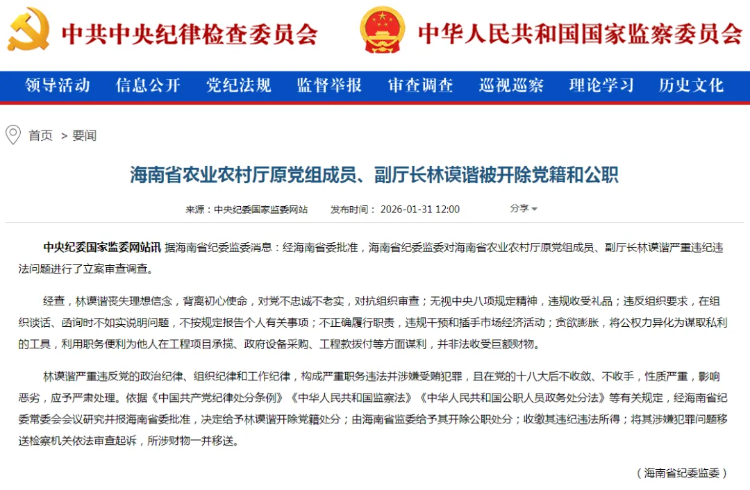 2026年1月,据海南省纪委监委消息:经海南省委批准,海南省纪委监委对海南省农业农村厅原党组成员、副厅长林谟谐严重违纪违法问题进行了立案审查调查。