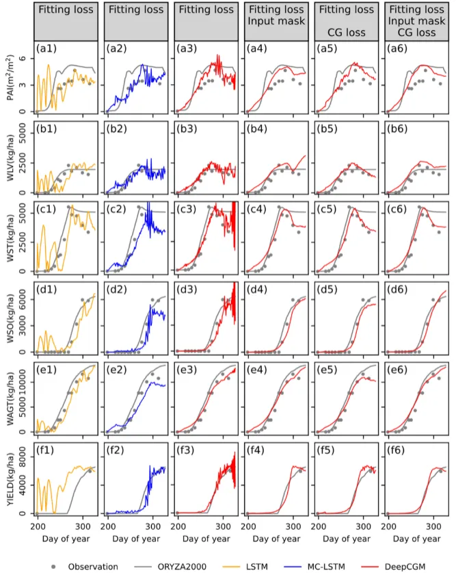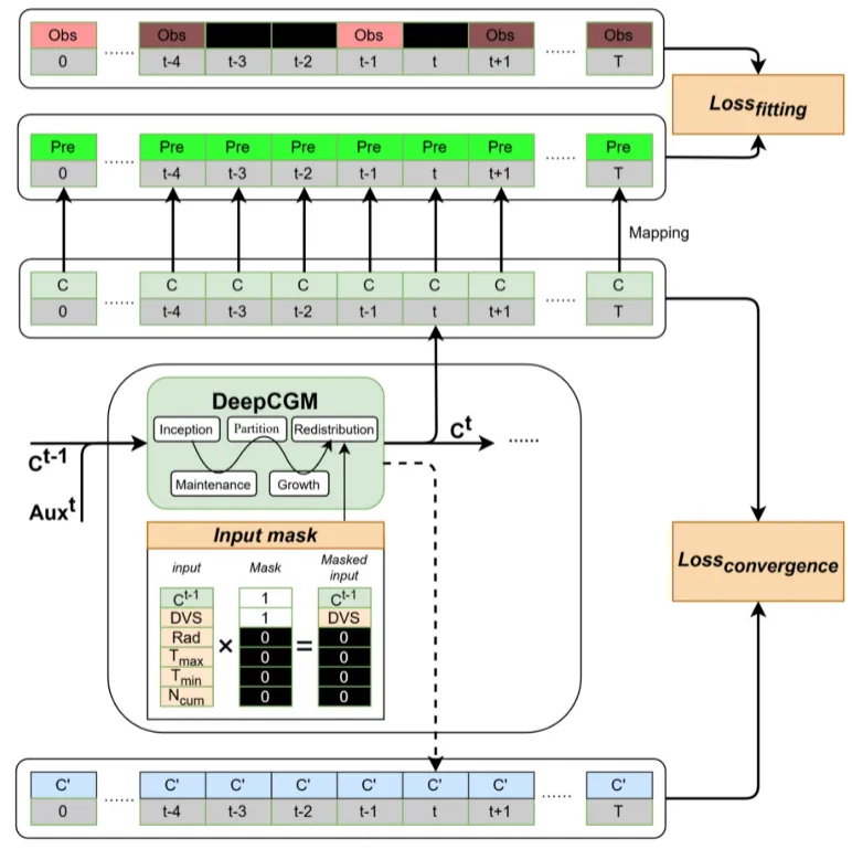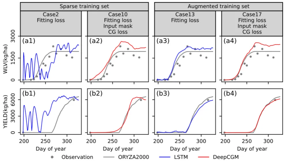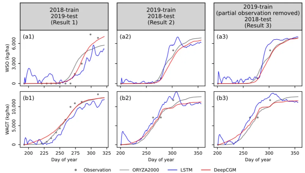 研究方法:本研究提出了一种具有质量守恒架构的深度学习作物生长模型(DeepCGM),该架构遵循作物生长原理。针对稀疏数据集训练,额外设计了两个关于作物生理学和模型收敛性的知识引导约束。通过一项为期两年、包含105个试验田的水稻实验观测数据集,将DeepCGM与基于过程的作物模型(ORYZA2000)和两种经典深度学习模型进行对比评估,同时采用数据增强方法。为验证所提模型的有效性和泛化能力,本研究还复现了一项为期三年、共计122个试验田的水稻实验案例研究。