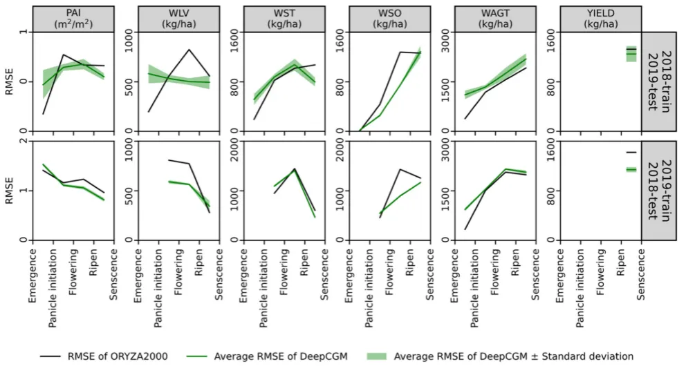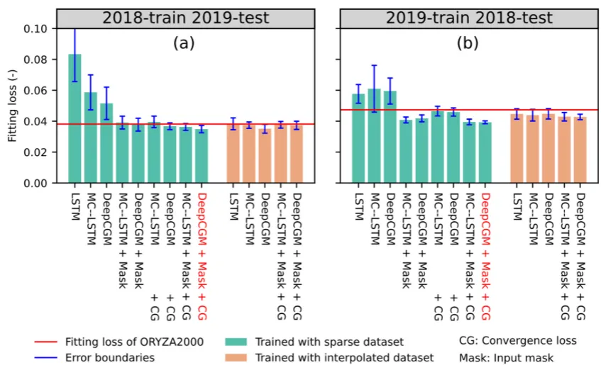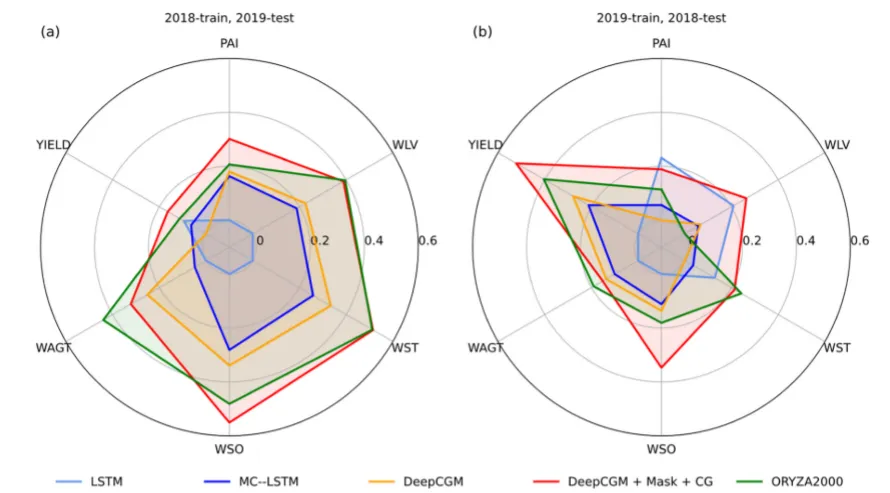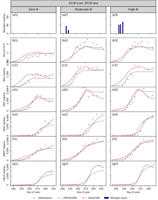 研究结果:DeepCGM架构能为所有模拟变量生成物理可信的作物生长曲线,而经典机器学习模型可能产生违背质量守恒定律的不合理预测。此外,与传统基于过程的模型相比,DeepCGM能更精确地模拟观测到的生长过程,所有变量的整体精度(加权归一化均方误差)在2019年提升8.3%,2018年提升16.9%。