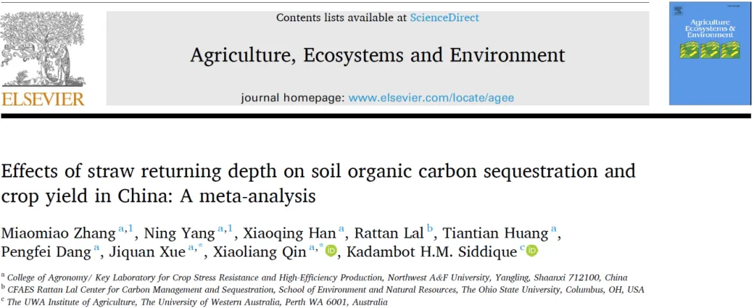 碳封存是缓解二氧化碳排放和应对全球气候变化的关键策略,秸秆还田在提高土壤有机碳(SOC)储量方面发挥着重要作用。然而,大多数研究都集中在表层秸秆还田及其对表层土壤有机碳的影响上,对不同秸秆还田深度(RD)对表层土壤(0 - 30 厘米)和亚表层土壤(30 - 60 厘米)有机碳储量(SOCS)的影响关注较少。本研究对中国 2290 个观测数据进行了Meta分析,以评估不同秸秆还田深度[0 厘米(RD0)、0 - 20 厘米(RD0 - 20)、20 - 30 厘米(RD20 - 30)和 30 - 60 厘米(RD30 - 60)]对两层土壤有机碳储量的影响及其与作物产量的关系。所有秸秆还田深度均显著提高了表层和亚表层土壤有机碳储量,并改善了土壤理化性质。RD20 - 30 对表层土壤有机碳储量的影响最大(14.3%),而 RD30 - 60 的影响最小(5.6%)。相反,RD30 - 60 对亚表层土壤有机碳储量的影响最大(30.3%),其次是 RD20 - 30(15.8%)。所有秸秆还田深度下作物产量均有所增加,其中 RD0 - 20(11.2%)和 RD20 - 30(10.0%)的增产幅度最大。然而,每种深度的效果因环境和管理条件的不同而有所差异。例如,在每公顷低于 8000 千克的秸秆投入量和壤土条件下,RD0 对土壤有机碳的增加效果最为显著;而在单季种植系统、旱地、粘壤土、低温少雨地区以及玉米秸秆还田的情况下,RD0-20 效果最佳;在双季种植系统、水田和水旱轮作土壤、高温多雨地区以及小麦或水稻秸秆还田的情况下,RD20-30 则最为有益。这些发现为支持中国农业系统中可持续的秸秆还田策略提供了基于证据的见解。