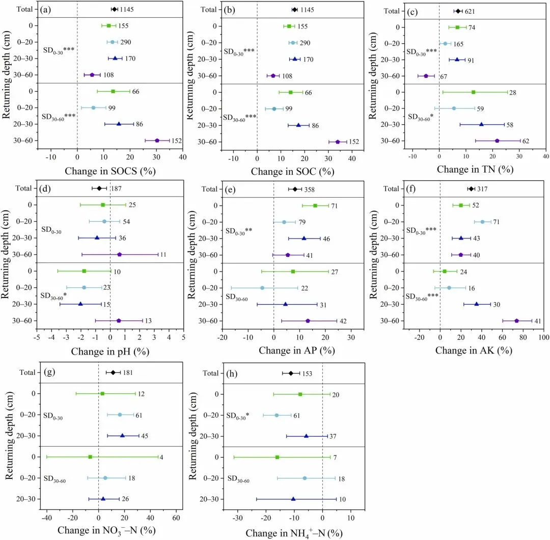 图3.秸秆还田深度对0–30 cm(SD0–30)和30–60 cm(SD30–60)土壤有机碳储量(SOCS)的影响,研究对象为不同(a)秸秆还田类型、(b)秸秆碳氮比、(c)秸秆施用量、(d)氮施用量、(e)磷施用量、(f)钾施用量、(g)秸秆还田持续时间和(h)种植制度。