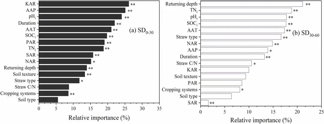 图4.基于随机森林回归模型,秸秆还田条件下(a) 0–30 cm 和(b) 30–60 cm 采样深度土壤有机碳储量 (SOCS) 响应中各变量的相对重要性 (%)。AAT:年平均气温,AAP:年平均降水量,SOCi:初始土壤有机碳,TNi:初始土壤全氮,pHi:初始土壤 pH,SAR:秸秆施用量,NAR:氮施用量,PAR:磷施用量,KAR:钾施用量。