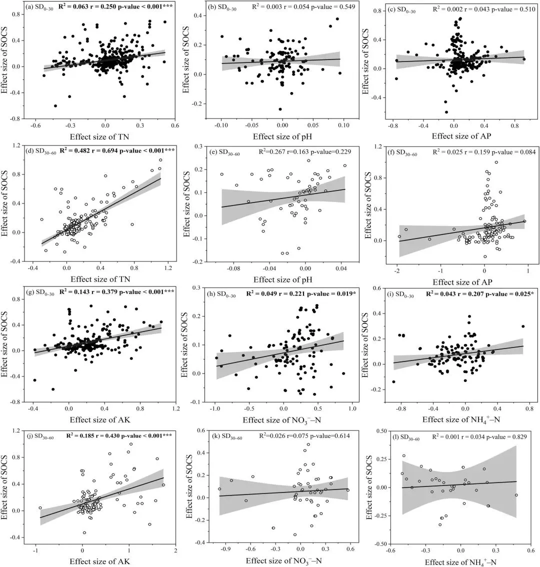 图5.0~30 cm (SD0~30) 和 30~60 cm (SD30~60) 采样深度处土壤有机碳库 (SOCS) 效应大小与 (a, d) 全氮 (TN)、(b, e) pH、(c, f) 速效磷 (AP)、(g, j) 速效钾 (AK)、(h, k) NO3--N 和 (i, l) NH4+-N 效应大小之间的关系。