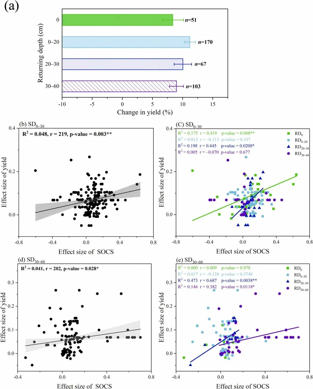 图6.(a)秸秆还田深度对产量的影响。柱状图和误差线分别表示平均效应大小和95%置信区间。(b)0–30 cm(SD0–30)和(d)30–60 cm(SD30–60)采样深度的产量效应大小与土壤有机碳库(SOCS)效应大小之间的关系,以及(c)SD0–30和(e)SD30–60采样深度[RD0 (0 cm)、RD0-20 (0-20 cm)、RD20-30 (20-30 cm)、RD30-60 (30-60 cm)]的产量效应大小与土壤有机碳库(SOCS)效应大小之间的关系。