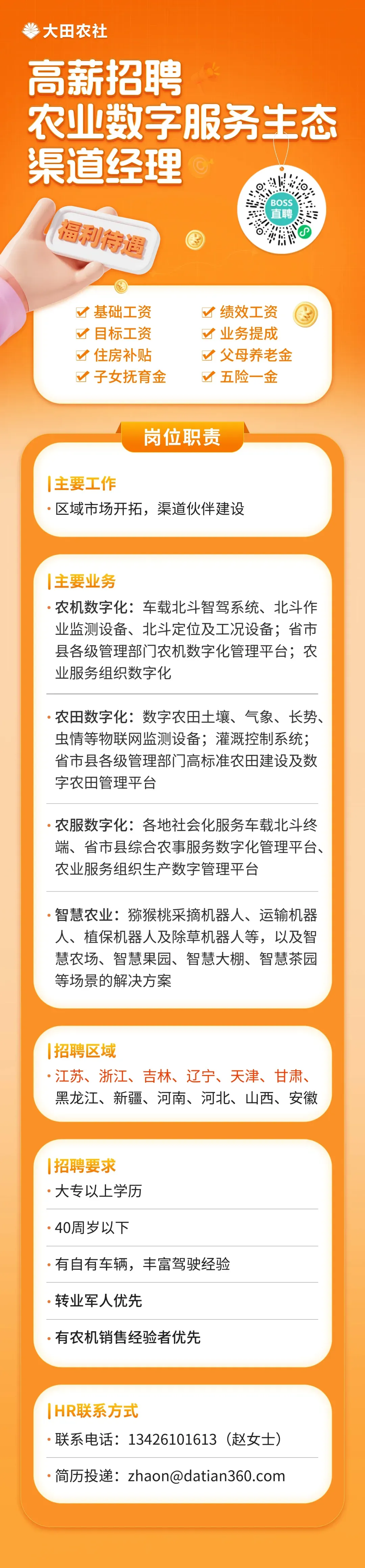 >诚聘农业数字服务生态渠道经理,高底薪+高提成,开拓区域市场!
