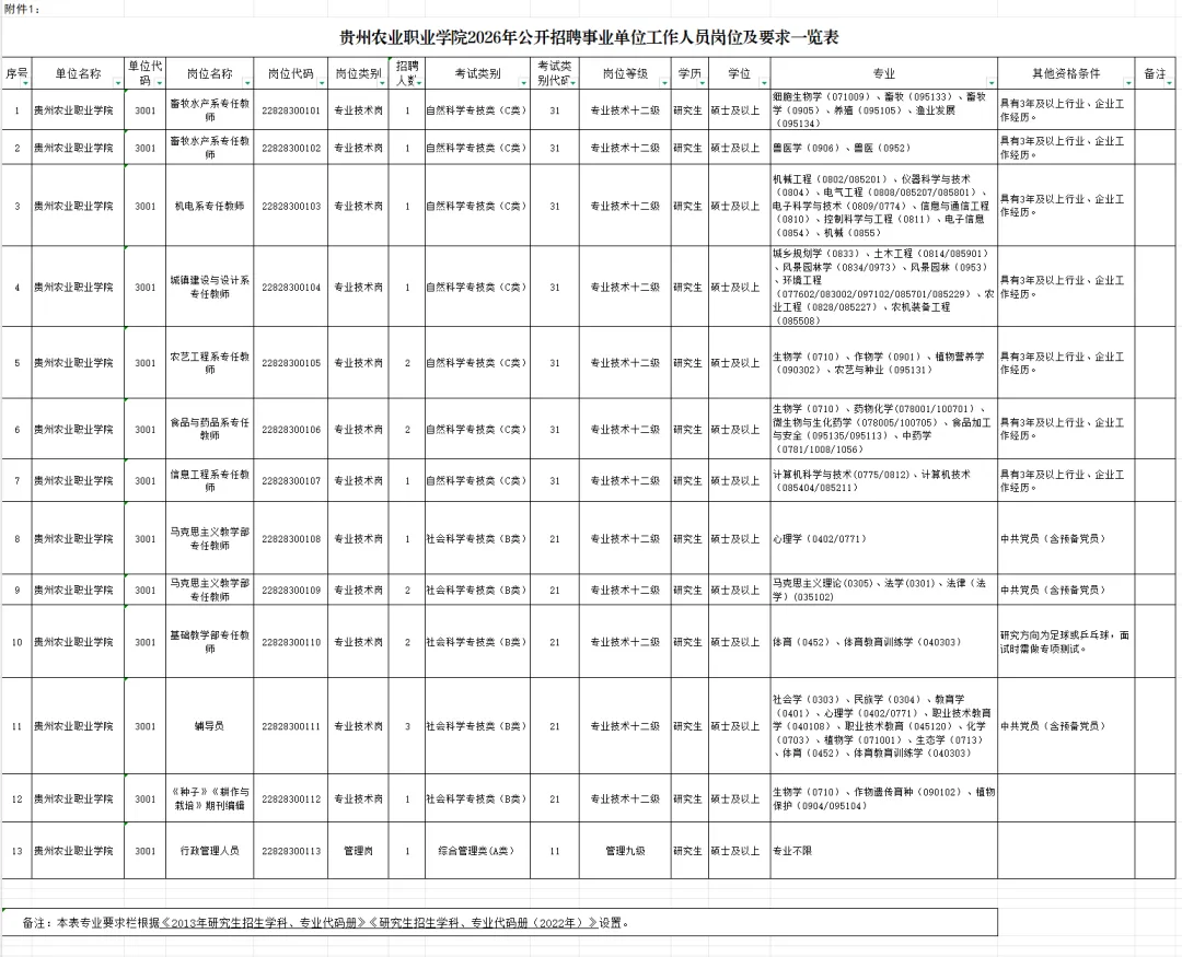 1. 贵州农业职业学院2026年公开招聘事业单位工作人员岗位及要求一览表.xlsx