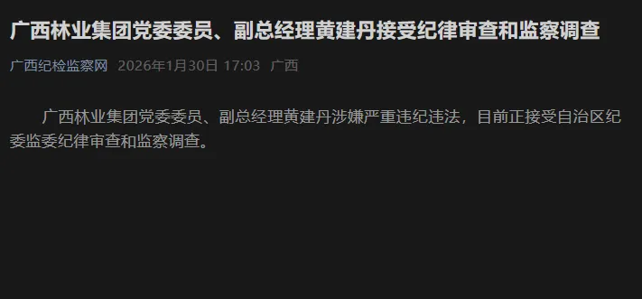 广西林业集团党委委员、副总经理黄某建丹涉嫌严重违纪违法,目前正接受广西壮族自治区纪委监委纪律审查和监察调查。这则通报字字千钧,如同惊雷炸响在八桂大地的上空,宣告了又一只国企“蛀虫”的末路。作为一名在体制内摸爬滚打多年的厅局级干部,黄某建丹本应是林业发展的“守护者”,如今却沦为了阶下囚,其政治生涯不仅画上了句号,更留下了一地鸡毛。