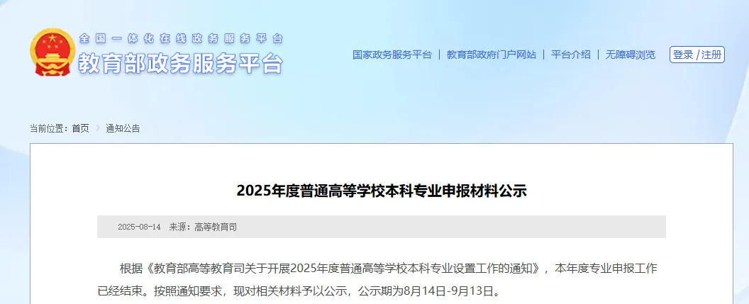 日前,教育部发布《2025年度普通高等学校本科专业申报材料公示》,对2025年度普通高等学校本科专业申报结果进行公示。