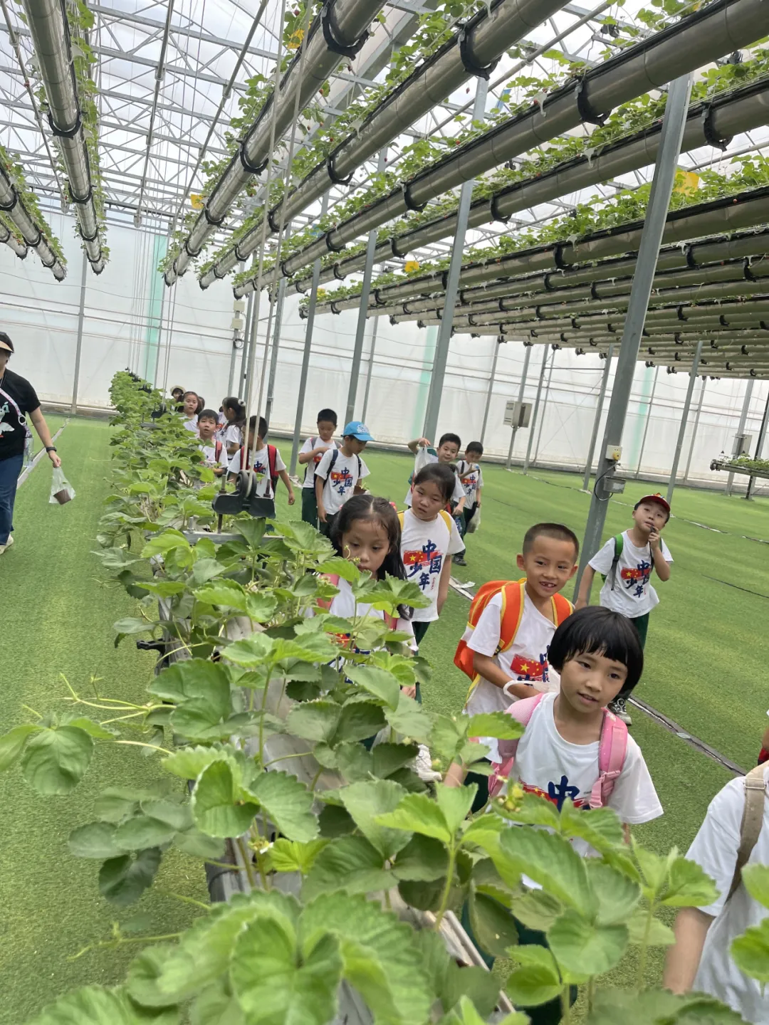 同学们第一个来到的地方是空中草莓园。空中种草莓,这是什么黑科技啊!同学们都纷纷驻足观赏、热烈地研究和讨论起来。随后在技术员的讲解下,更好地了解植物以及科技大棚的相关知识,体会到科技与农业结合的巨大魅力。