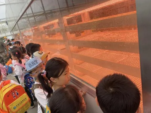 我们穿过暗黑的消毒“隧道”来到新型智能蔬菜工厂,哇!好壮观、好神奇的生菜园!这是一个智能蔬菜种植工厂,是机械化、自动化、数字化、互联网技术的完美融合。导游手拿着生菜,给同学们讲解生菜的种植和栽培原理。听完之后,同学们都觉得实在是太厉害了!