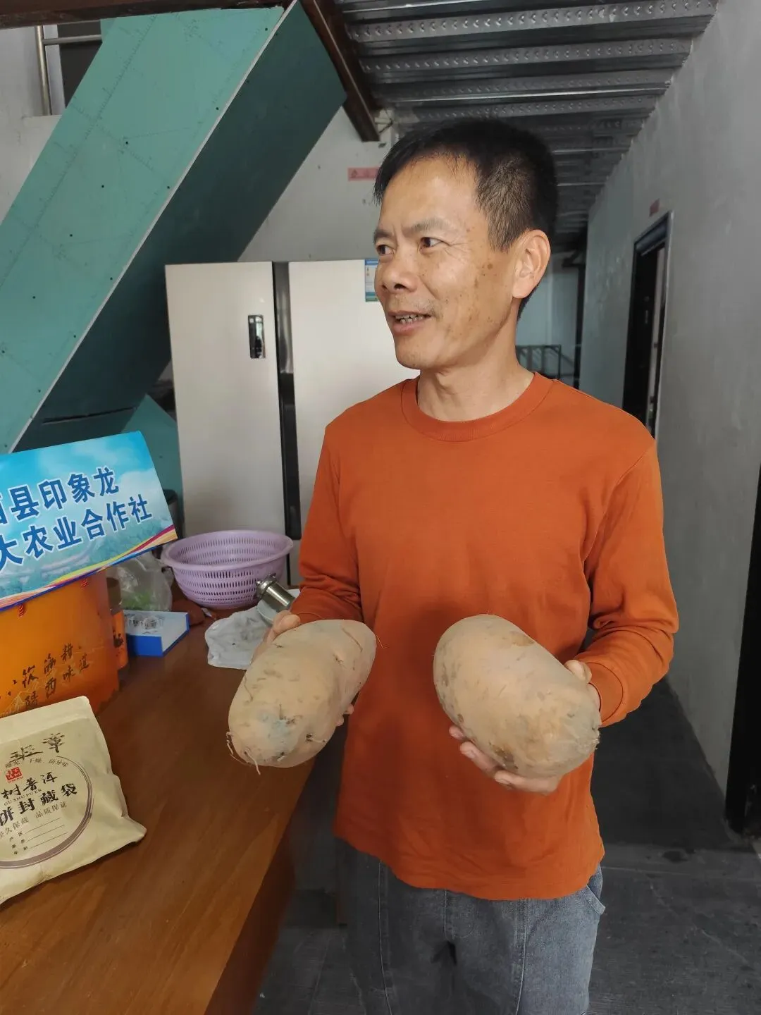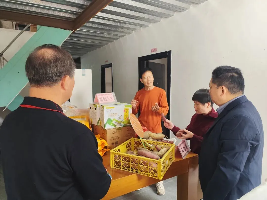 郭亮介绍,合作社共拥有租用土地约2000亩,分三大片,一片在织贡镇、一片在塘口镇,一片在溪头镇。主打两大产业:一是主打富硒水稻种植产业,实施稻、薯间种,提高地力,减少病害,增加富硒粮食供应市场,促进农业的高质高效;二是主打五彩薯产业,又以五彩薯中的最优品种——榴莲薯为主,促进高产高质高效的实现。 郭亮进一步介绍说:榴莲薯是合作社于2024年8月引进的“五彩薯”高端品种,因其薯肉金黄、口感软糯香甜酷似榴莲而得名,市场售价可达每斤8元。通过与省农科院合作进行种苗脱毒处理,并严格筛选独特的沙壤土进行种植,从源头确保了产品的独特品质与高端定位。