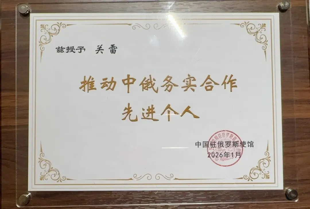 1月30日,北欧林业境外园区董事长关雷,凭借在中俄林业资源协同开发、境外园区建设运营及跨境产业链构建等方面的突出贡献,荣获“年度推动中俄务实合作先进个人”称号,成为中俄林业务实合作领域的标杆人物。