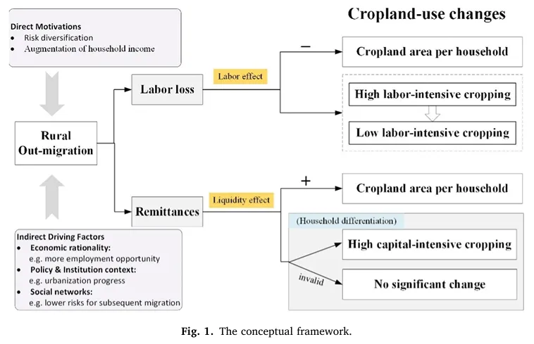 我们的框架预测,农村人口外流通过两种主要机制影响耕地利用变化:减少农村劳动力供给和增加汇款流入。图1绘制了这些机制,并将其与潜在的耕地利用结果关联起来,同时考虑了家庭的主要收入来源。