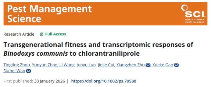 “Transgenerational fitness and transcriptomic responses of Binodoxys communis to chlorantraniliprole”文章发表在《Pest Management Science》。氯虫苯甲酰胺(CAP)对棉蚜优势内寄生蜂棉蚜刺茧蜂(Binodoxys communis)具有显著跨代不利影响,且这种影响通过能量代谢关键基因BcIVD(异戊酰辅酶A脱氢酶)调控;评估杀虫剂生态风险需纳入分子机制与跨代效应,为农田生态系统中天敌昆虫保护及可持续害虫治理提供关键依据。