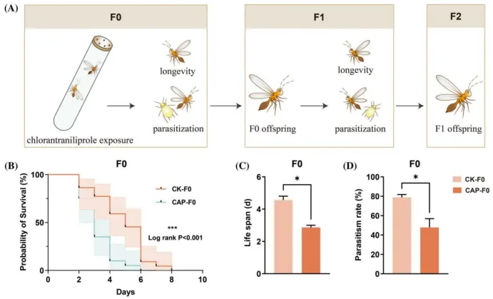 跨代适合度损失:F0代暴露后,存活率、寿命显著下降,寄生率从对照组78.89%降至47.78%;F1代存活概率降低、寿命缩短、寄生率下降31.11%,存活率下降14.42%;F2代发育延迟,存活率显著降低37.78%,羽化率呈下降趋势。