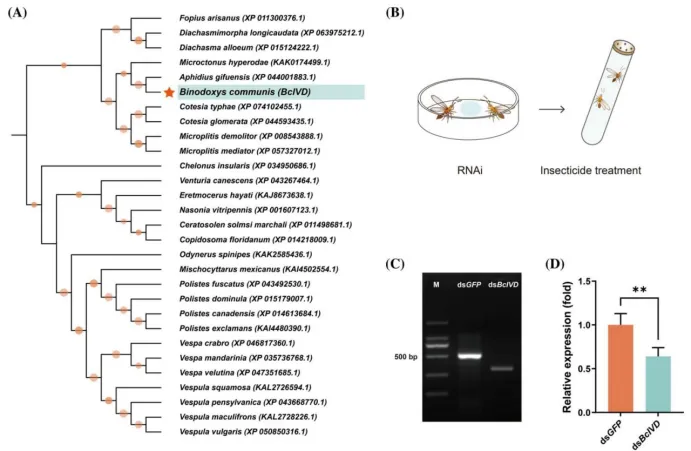 BcIVD基因功能:该基因在长期暴露后显著上调,RNAi沉默后蜂对氯虫苯甲酰胺的敏感性显著增强,死亡率升高、发育延迟及繁殖力下降等效应加剧。