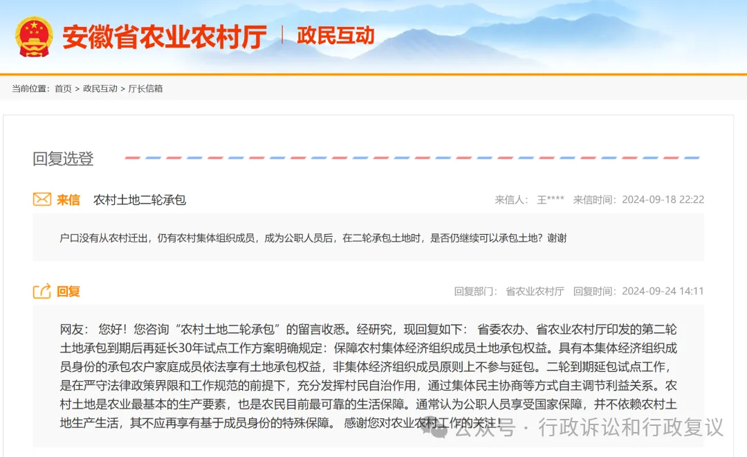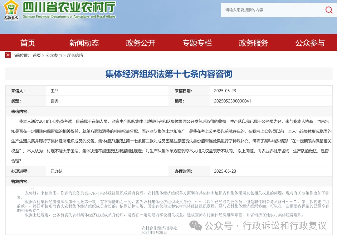 2025年5月23日,网友王某给四川省农业农村厅写信:我本人通过2018年公务员考试,目前属于在编人员。老家生产队队集体土地被征占和队集体果园公开发包后取得的收益,生产队以我已属于公务员为名,未与我本人协商,也未告知是否在一定期限内保留我的相关权益,就单方面取消我的相关权益分配。而这些队集体土地和资产,是我在考上公务员以前就存在的。在我考上公务员以前,本人与该集体形成稳固的生产生活关系并履行了集体经济组织成员的义务。集体经济组织法第十七条第二款对成员因某些原因丧失身份后牵连效果进行了特殊补充,明确了某种特殊情形“在一定期限内保留相关权益”。本人认为:村规不能大于国法,集体决定不能违反法律强制性规定;对生产队集体单方面剥夺本人相关权益表示不认同。 以上问题,向农业农村厅咨询,生产队的做法,是否合理?