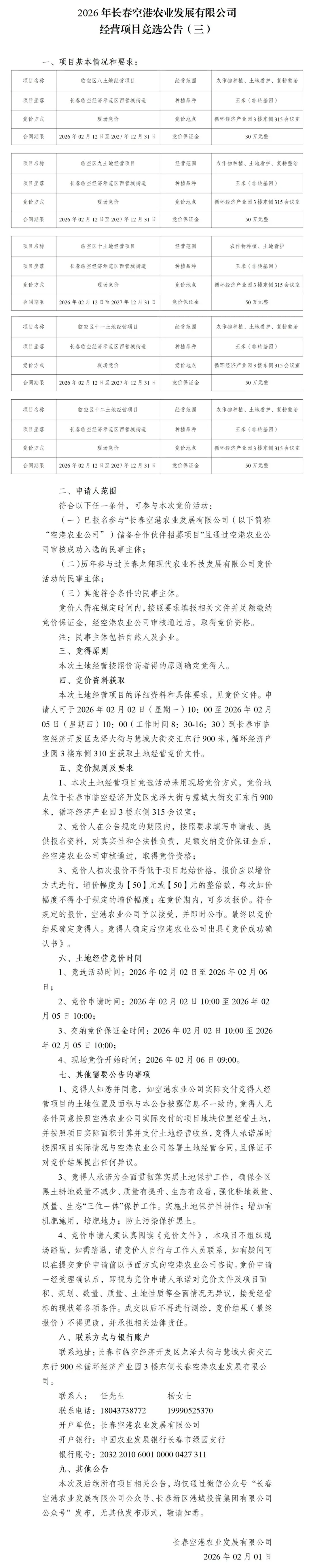 >2026年长春空港农业发展有限公司经营项目竞选公告(三)